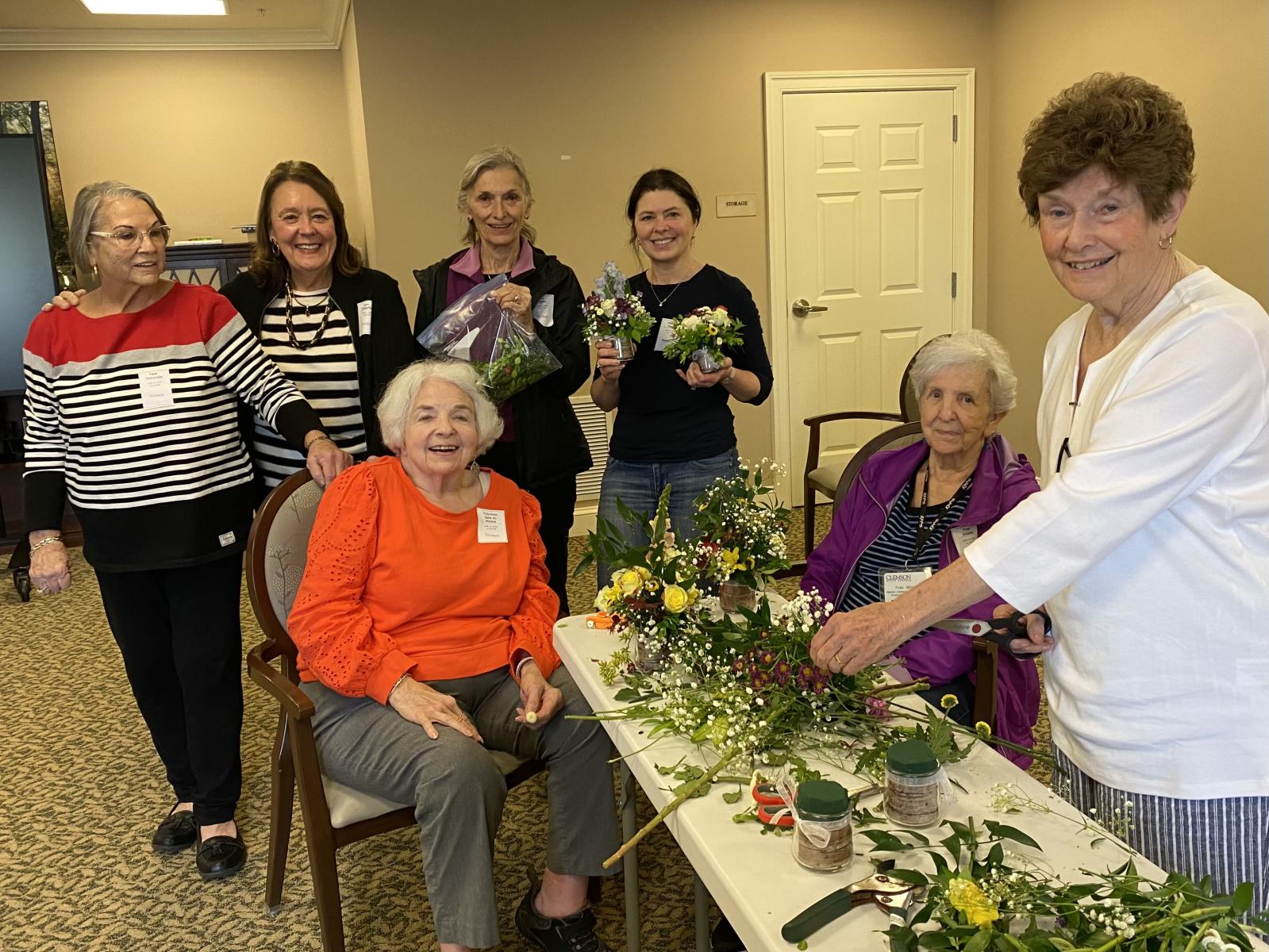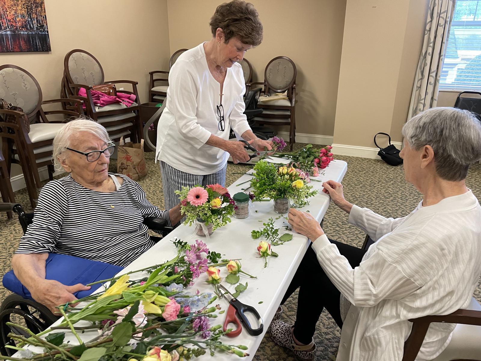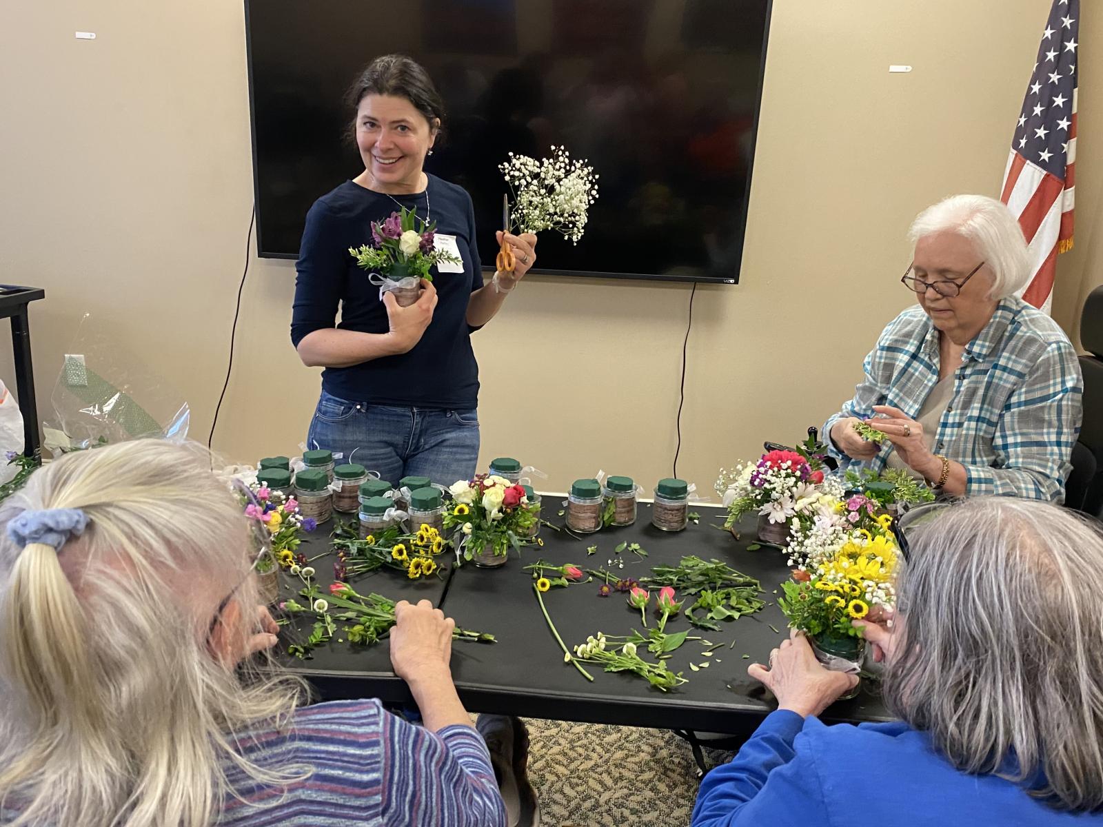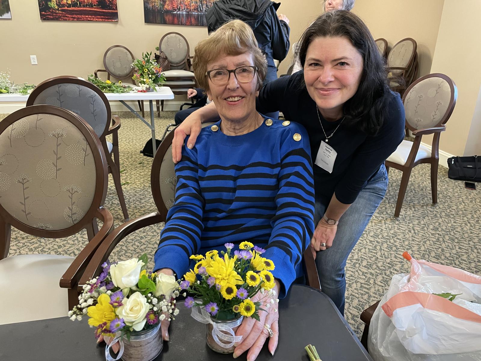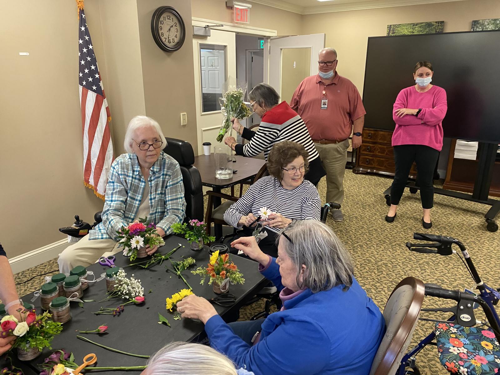 Bringing joy to seniors in a nursing home facility with bouquets.